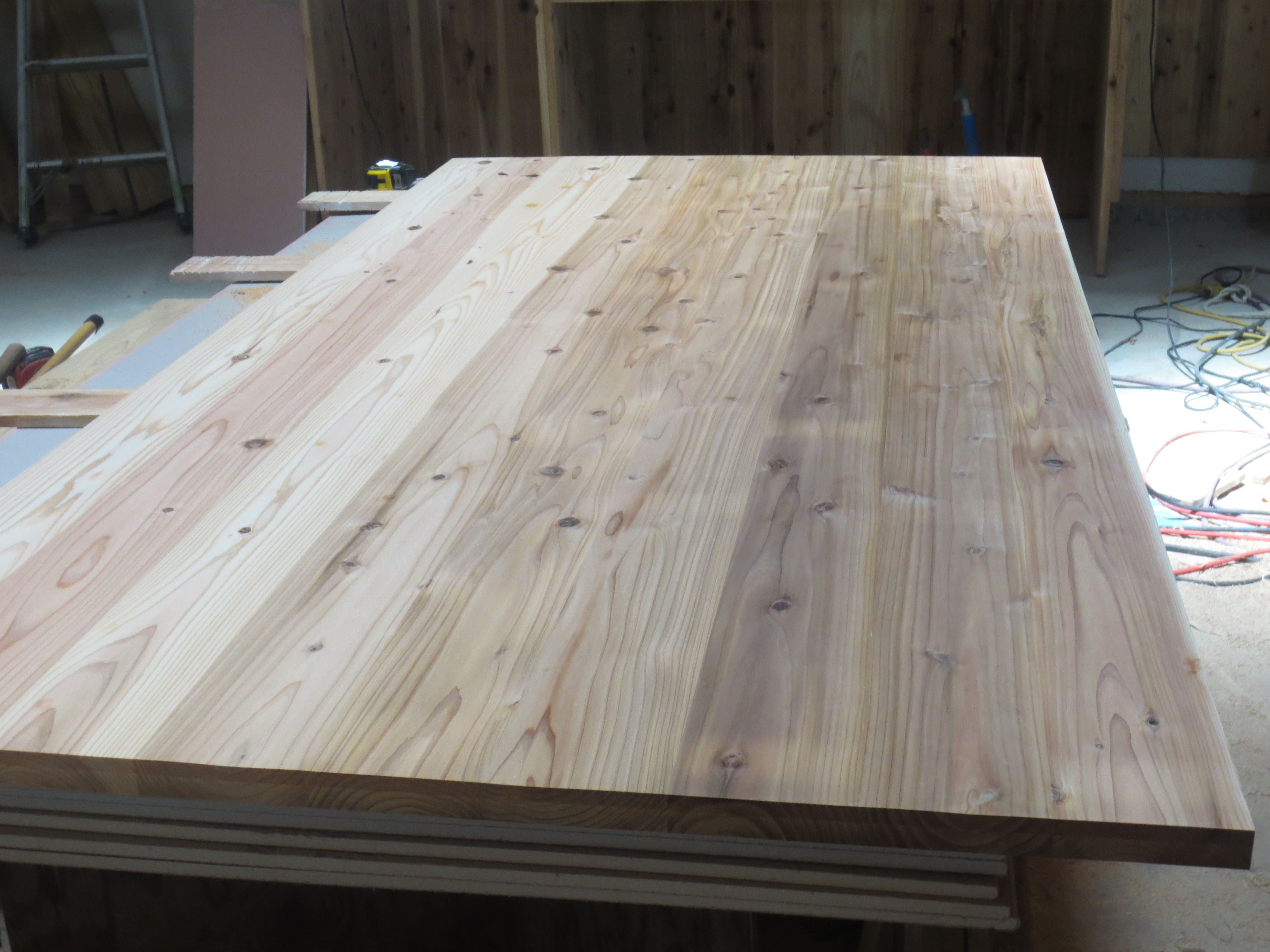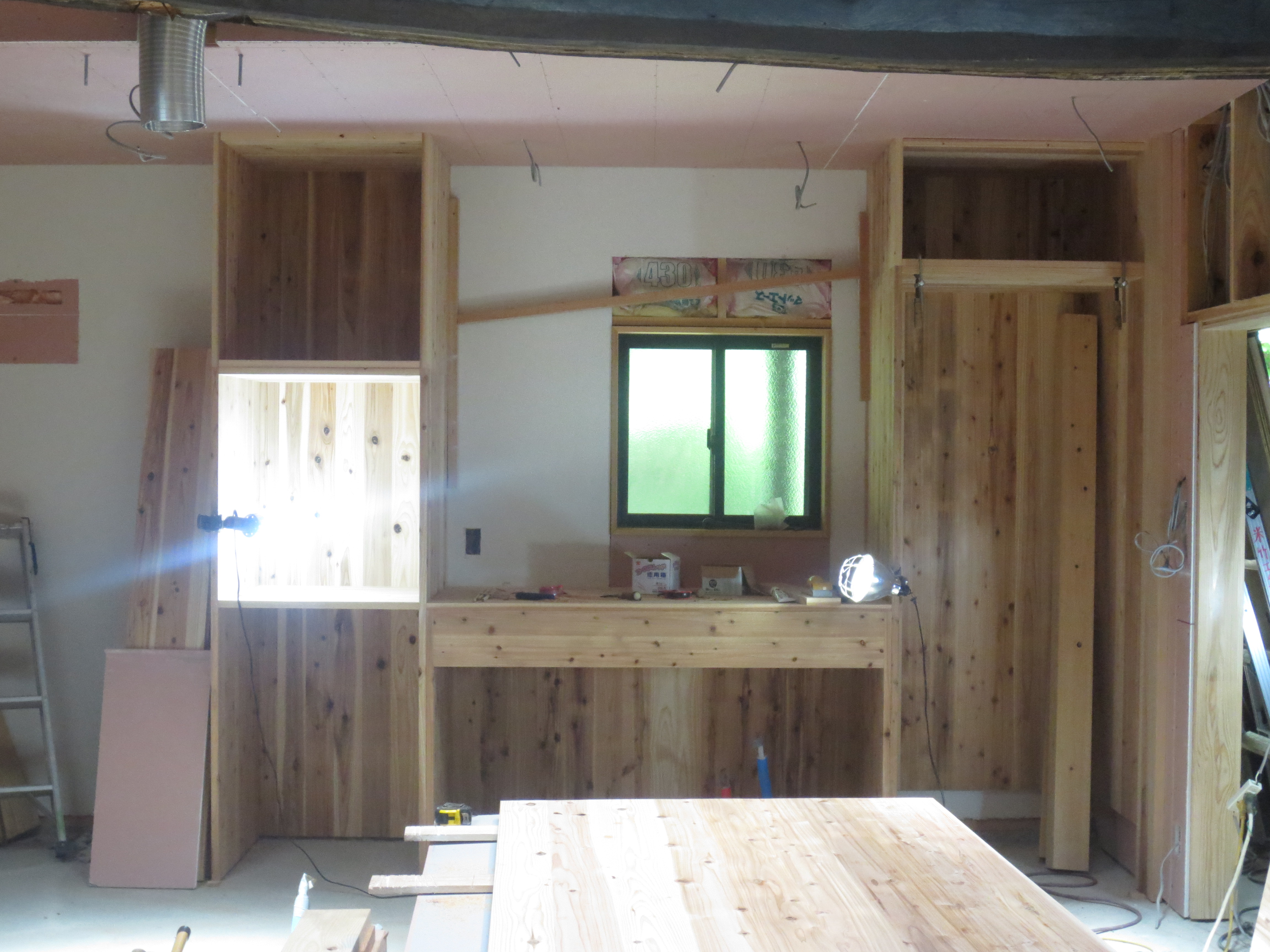 厚さ24×幅900×長さ1800の杉ムクボードを使用し、収納棚やキッチンのバックヤードを製作中!
