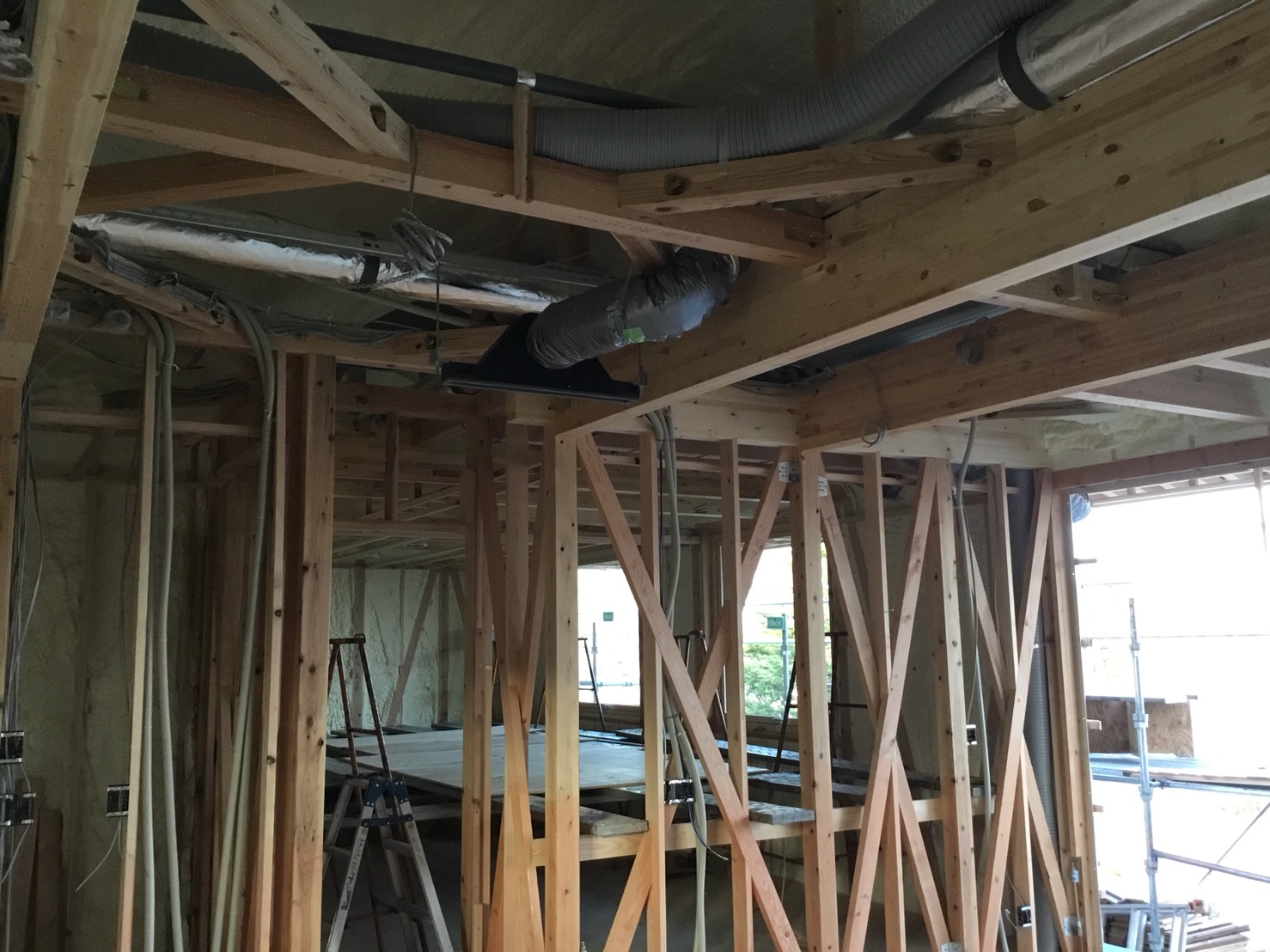 天井にある配管は、地下・小屋裏・室内の風を循環する、全館空調になります。